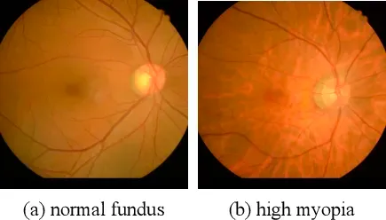 比如下图右侧图(b)是一个高度近视的人的眼底,有一些像裂开一样的纹理,这就是豹纹状眼底。
